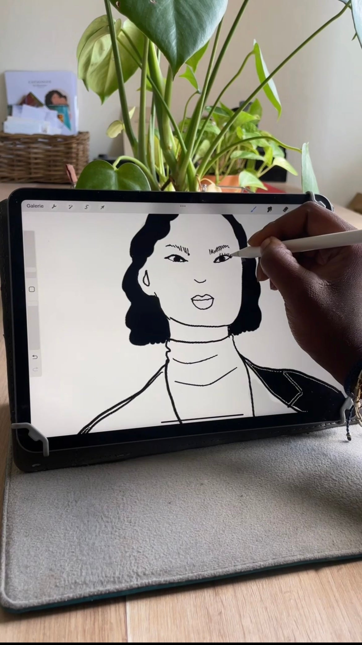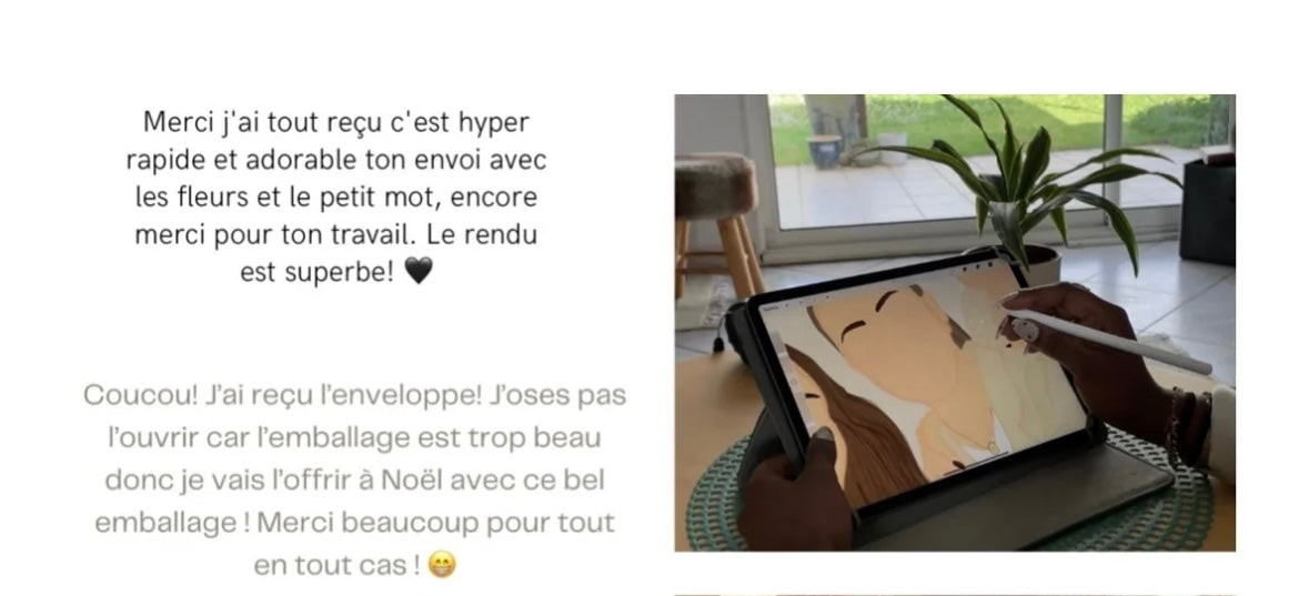 Je réalise mes illustrations sur croquis puis sur ma tablette graphique, avec beaucoup de temps et de minutie pour chaque détail. Une fois le dessin terminé, je l’imprime et je l’envoie avec le plus grand soin.