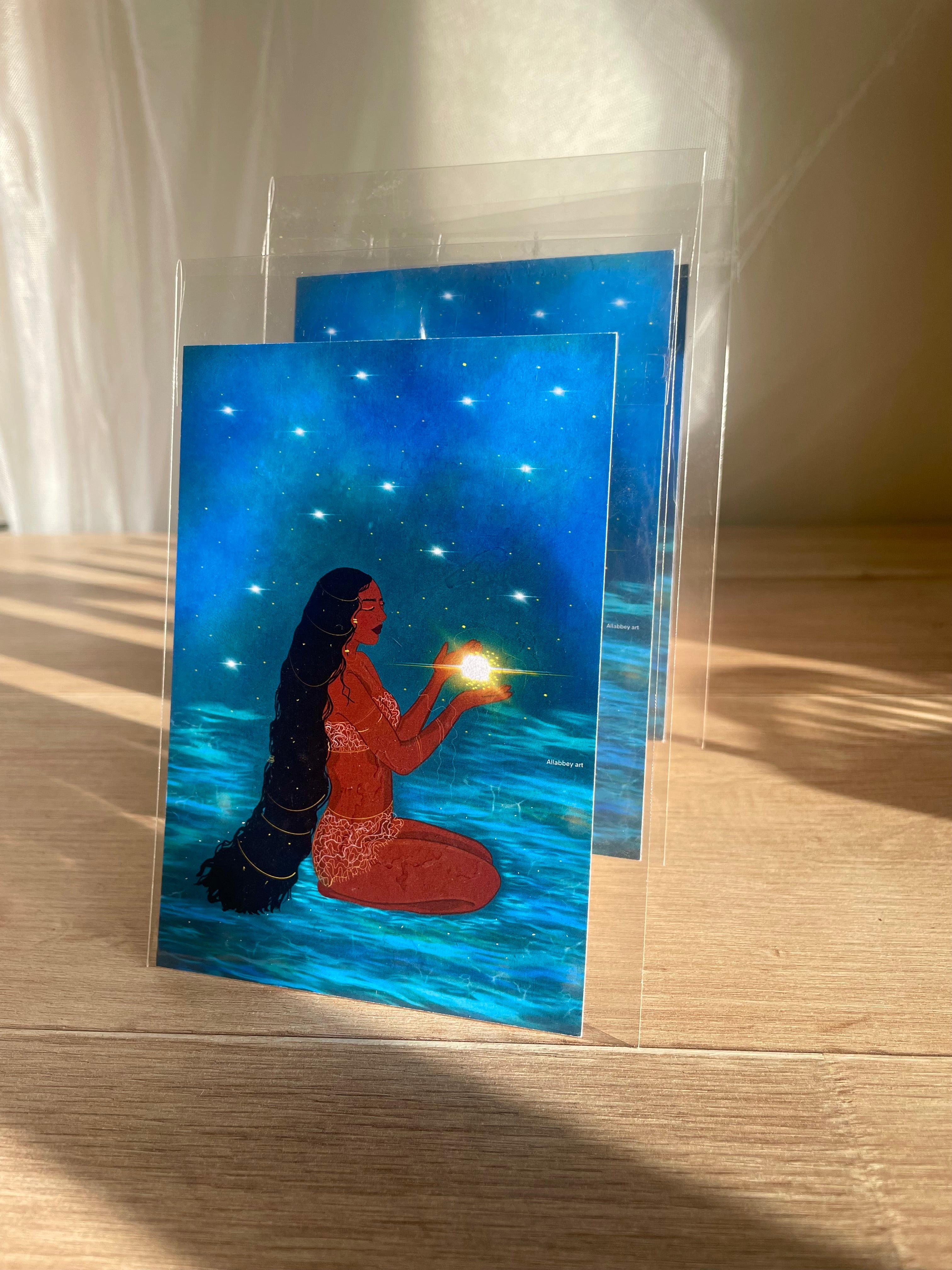 Je réalise des illustrations personnalisées ainsi que des créations issues de mes collections originales, inspirées par mes voyages intérieurs, mes recherches identitaires et les récits qui me touchent.